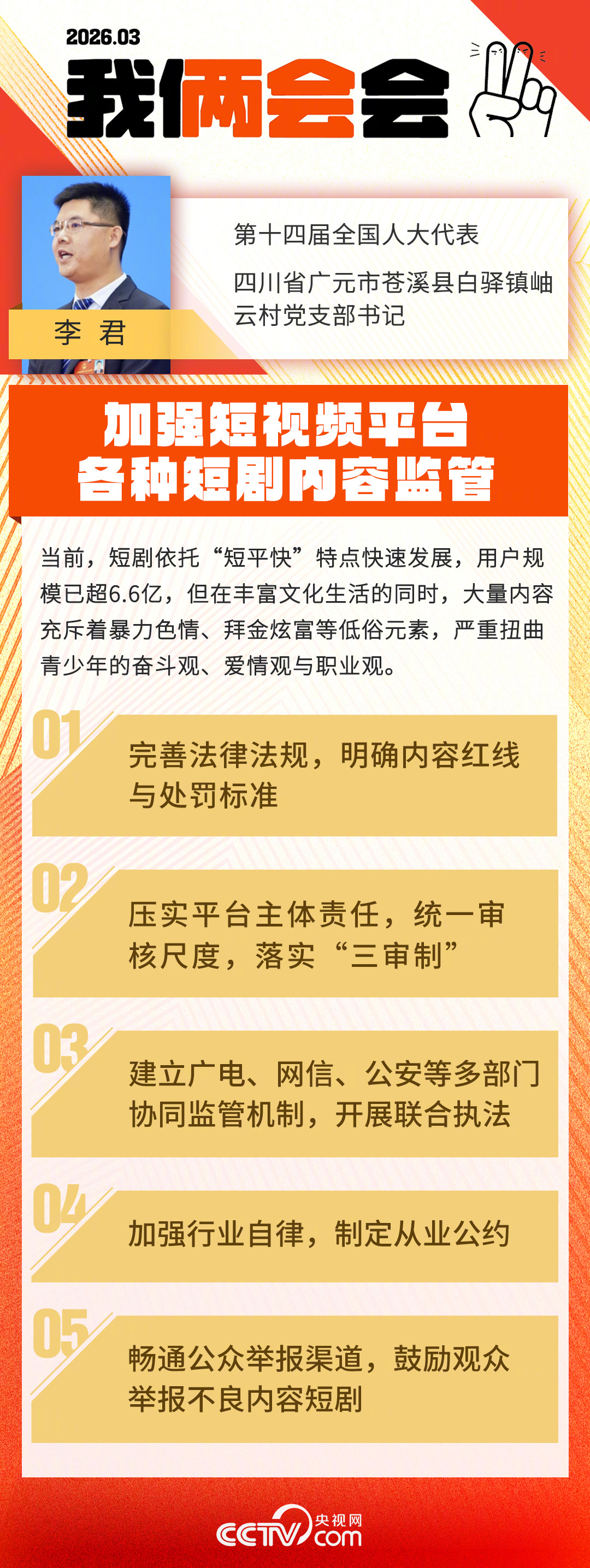 全国人大代表、四川省广元市苍溪县白驿镇岫云村党支部书记李君表示,当前,短剧依托“短平快”特点快速发展,用户规模已.6亿,但在丰富文化生活的同时,大量内容充斥着暴力色情、拜金炫富等低俗元素,严重扭曲青少年的奋斗观、爱情观与职业观。乱象根源在于制作门槛低、平台审核标准不一及监管法规细则缺失。